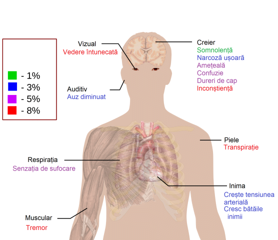 - la 20 000 ppm (2%) devine ușor narcotic, creste tensiunea arteriala, pulsul și scade auzul