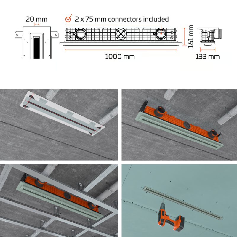 de tubulatură, flexibile din plastic (75 mm și 90 mm). Conexiunile pentru tubulatură permit montarea pe verticală sau orizontală. - Instalare simpla si usoara: Montarea acestui anemostat este similara cu instalarea luminilor LED incastrate, poate fi facuta cu usurinta de o singura persoana. Difuzorul Single este fixat de tavanul de beton inainte de instalarea cadrului pentru gips-carton.