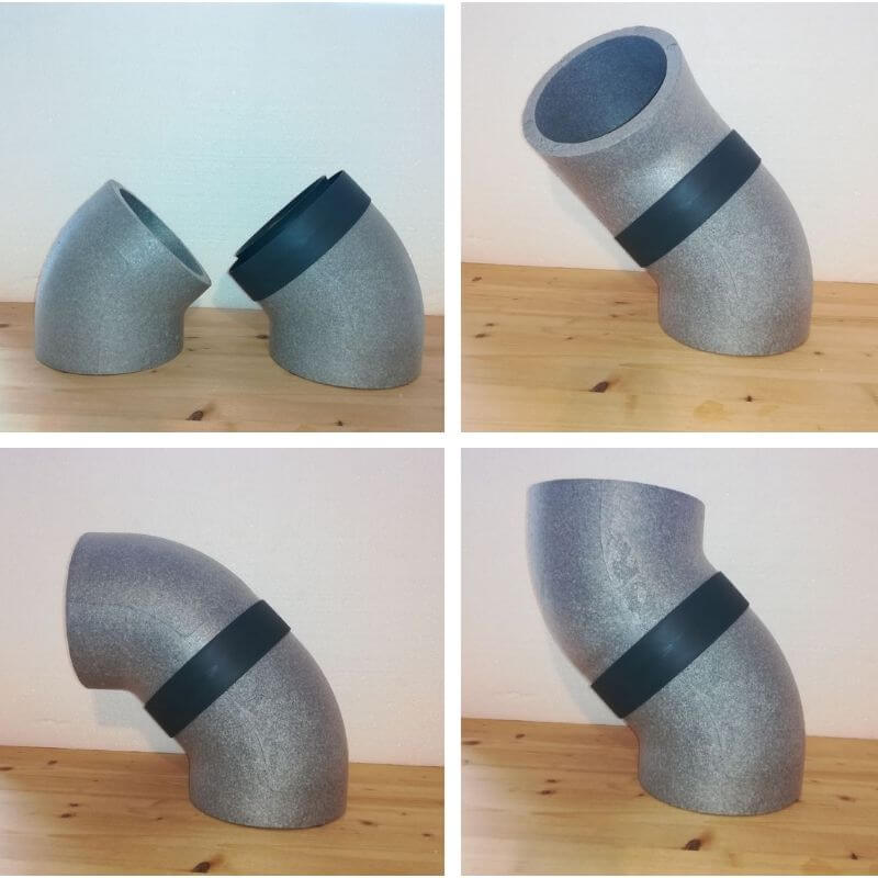 Cotul de 90°, se formeaza din doua coturi de 45° cu ajutorul unei mufe de plastic prin simpla impingere.