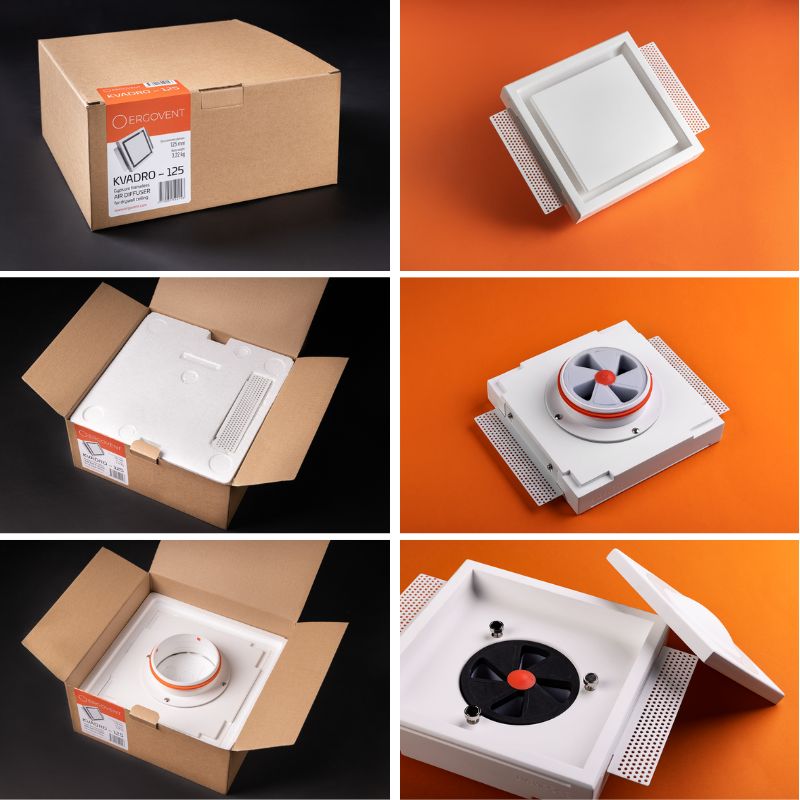 Ergovent Kvadro 100 este un difuzor de aer destinat schimbului de aer din inetiorul încăperilor. Spre deosebire de gilele și anemostatele obișnuite confectionate din plastic, acestea sunt realizate din gips. Astfel se integreaza perfect in tavanul sau peretii din rigips si se vopsesc in ton cu suprafața în care se integrează.