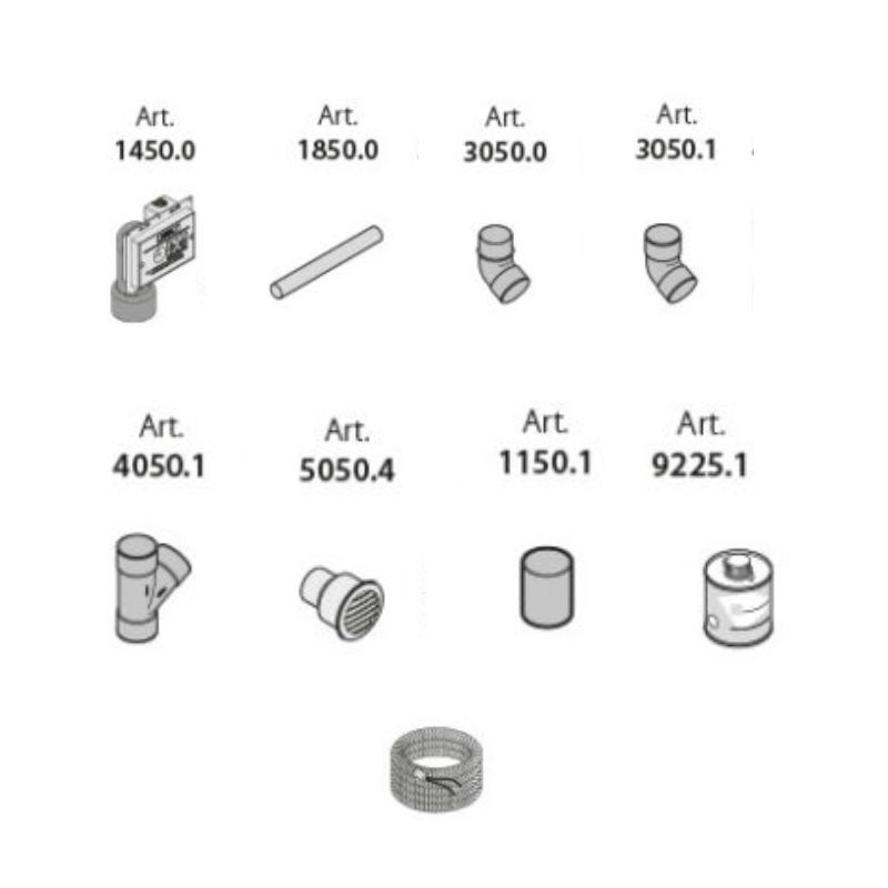 Kitul de instalare conține toate componentele necesare pentru realizarea unui sistem de aspirație centralizat.